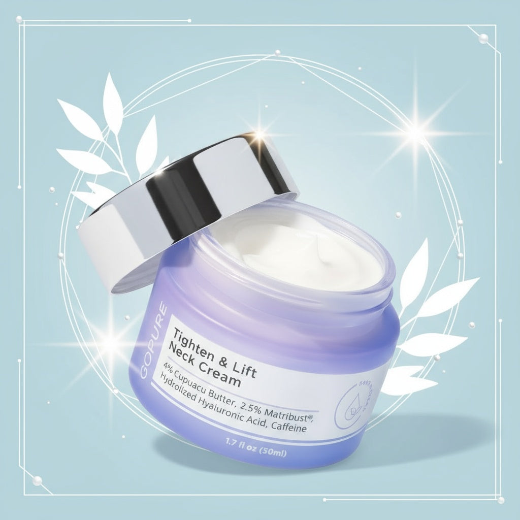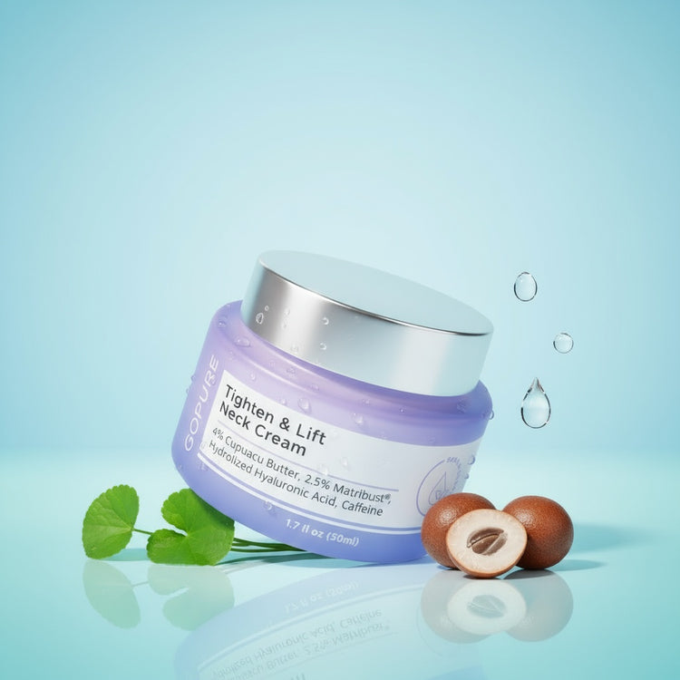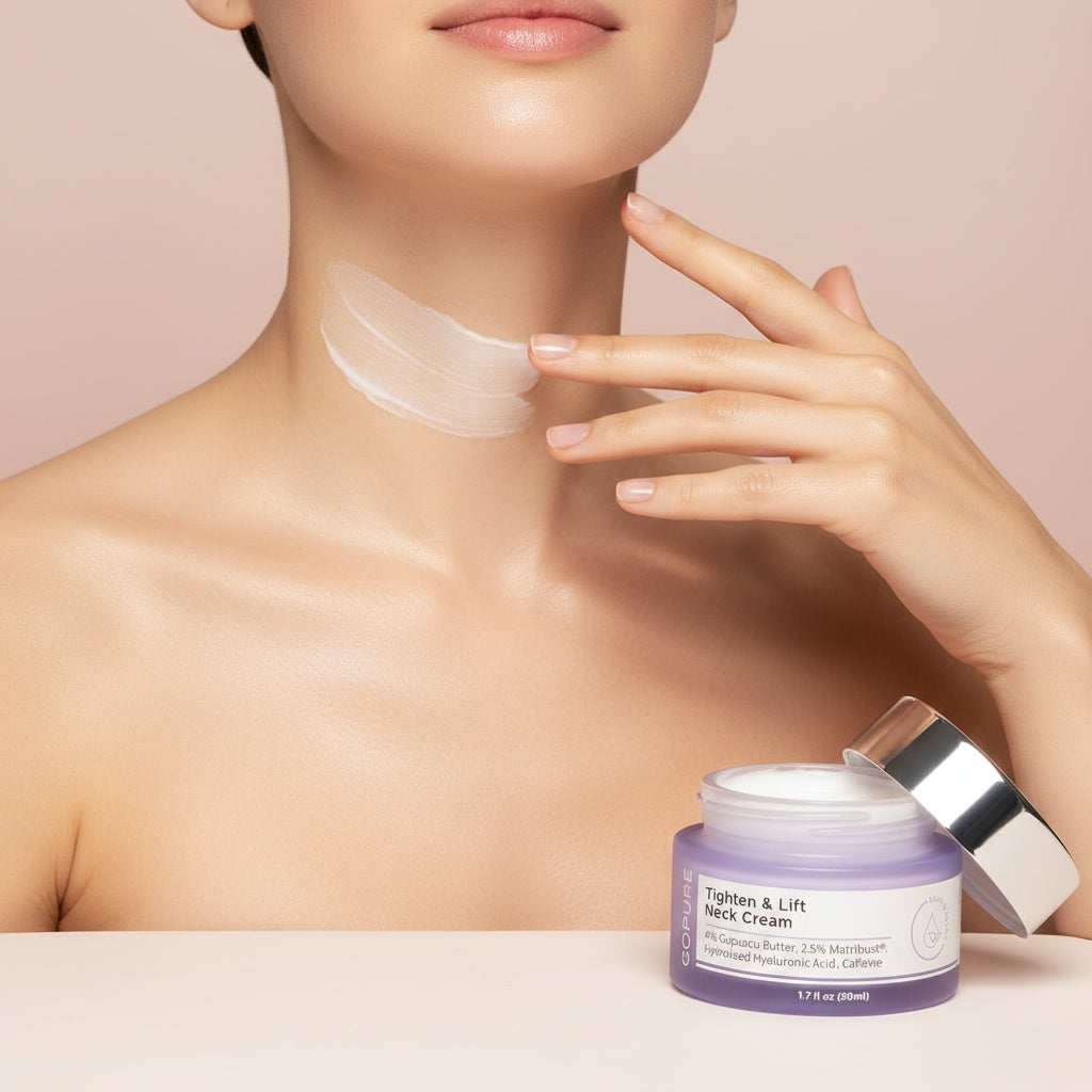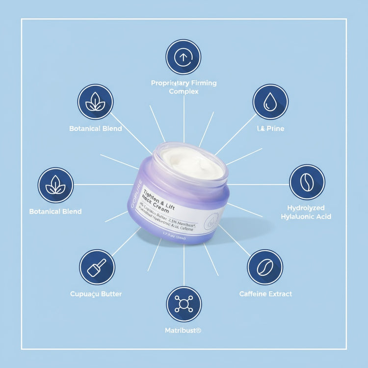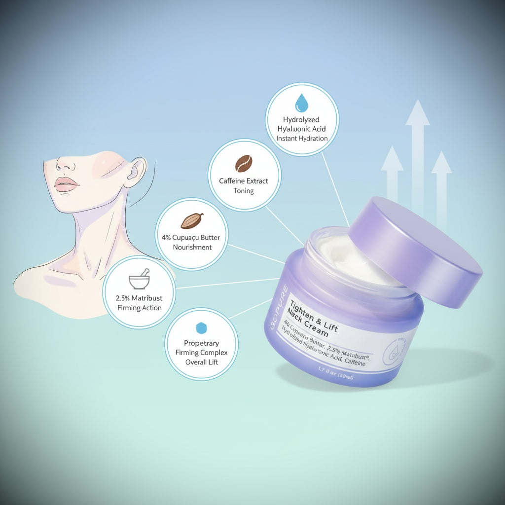 Combines firming complex, hyaluronic acid, caffeine extract, Matribust, cupuaçu butter, and botanicals for lifted, hydrated, and smooth neck skin.